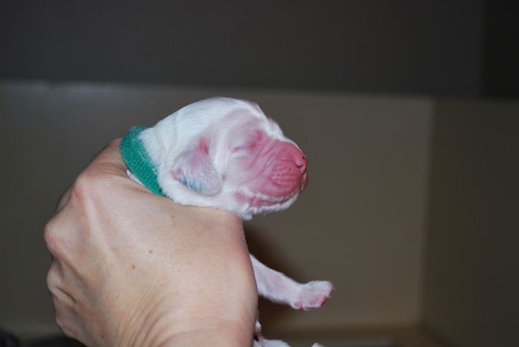 Candy, green collar girl, black markings inside her ears, so she'll be a blue or a tri